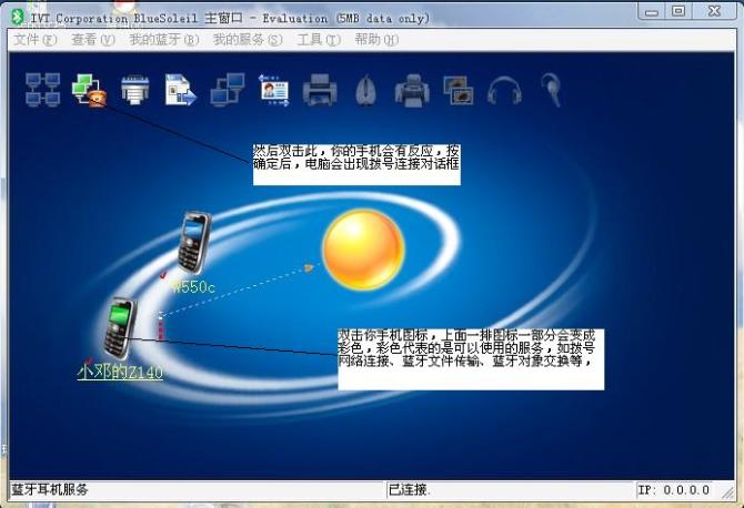 启动你的蓝牙,会出现蓝牙的主窗口,点击上面的“我的蓝牙”——“搜索蓝牙设备”,当搜索到你的手机后主窗口会出现一个手机图标(我的是小邓的Z140),OK,那代表你的手机,别客气,双击它,主窗口上面的一排图标会变成彩色