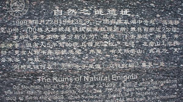 无独有偶,1999年6月22日19左右,湖北省武汉东湖风景区里磨山景区发生类似事件,据目击者描述是从湖面升起的水柱击倒了附近山上710棵大树,当然这个更可能类似水龙卷,假如发生在现在的话人手一个手机,掏出来拍下就是了,还愁找不到肇事者吗?但这可能性已经没有了,事件已经发生,证据难以追溯!