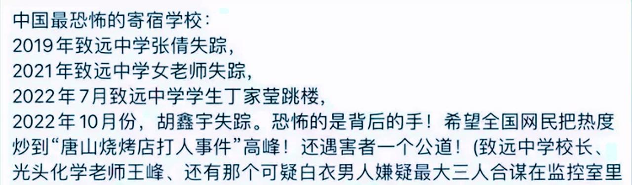 具体的失踪人为:2019年,学生张倩离奇失踪,至今没有消息;2021年,外地女老师离奇失踪,至今没有消息;2022年7月,学生丁家莹坠楼,原因未知;2022年10月,胡鑫宇失踪,至今没有任何消息……