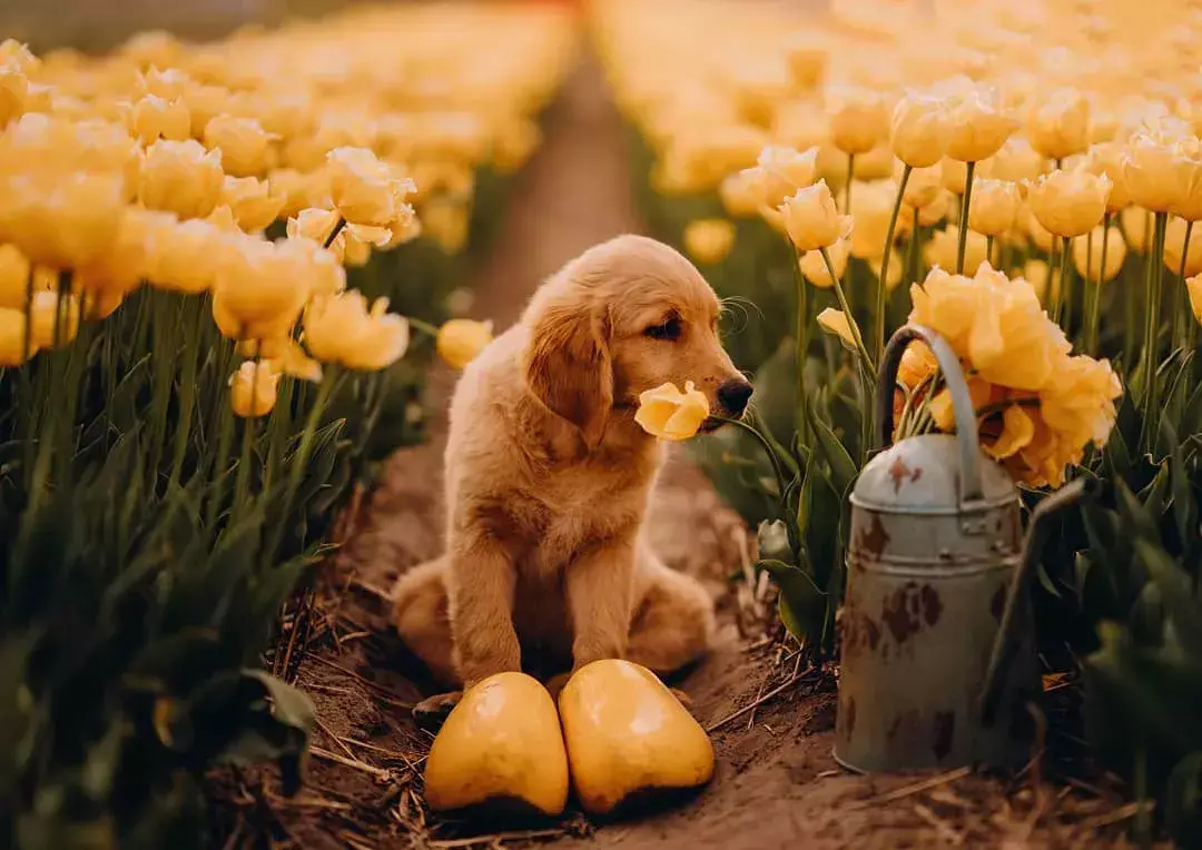 就和狗狗开始了忙碌的采花工作;