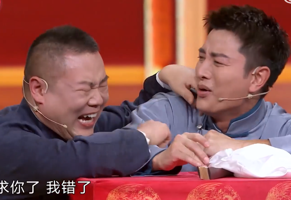 贾乃亮在台上都要哭了,说自己看提词器都不知道往哪接,最后求岳云鹏配合一下,缓和了之后贾乃亮已经满头大汗了,不过这段的逗笑效果也很不错啦!